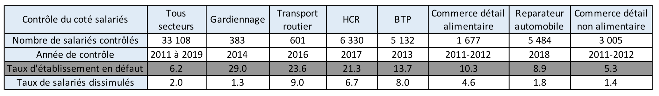 Globalement pour le privé en 2021, le manque à gagner en cotisations est estimé de 5,6 à 7,1Md€ dans le cadre du régime général et de l’Unedic (entre 2,2 et 2,7 % du total des cotisations déclarées et éludées). De nouvelles évaluations sont attendues à compter de 2023. La fraude relative au travail dissimulé est estimée entre 1,7 et 2,1 % des cotisations déclarées et éludées ; hors travail dissimulé, elle est de 0,5 à 0,6 %. Cette situation est stable depuis 2012.Les professions sont contrôlées à tour de rôle : les HCR en 2011-2012 et 2017, le commerce de détail alimentaire en 2011-2012, le commerce de détail non alimentaire en 2011-2012, le BTP en 2013, le gardiennage en 2014, le transport routier en 2016, la réparation automobile en 2018 et le nettoyage en 2019.
