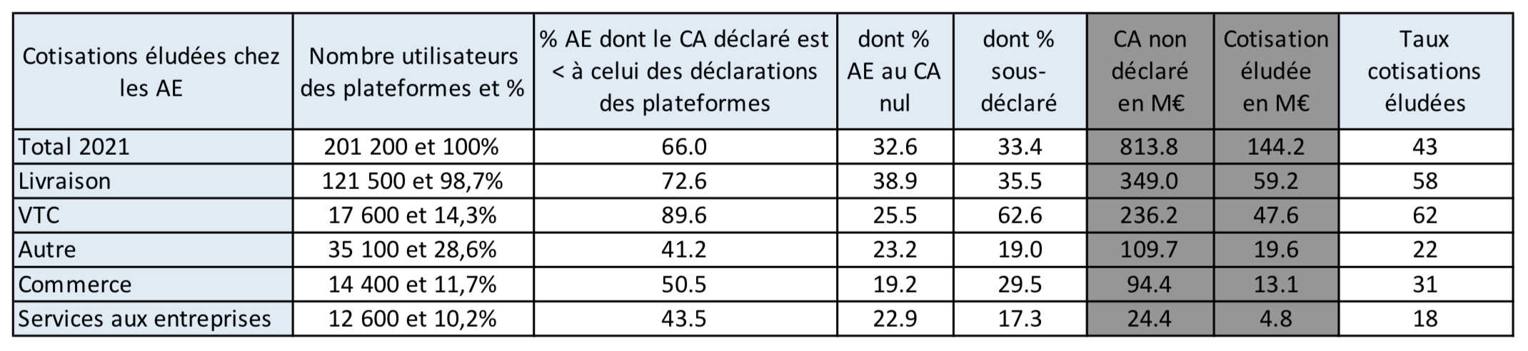 Au sein des microentreprises travaillant sur des plateformes, la part de cotisations éludées est évaluée entre 17 et 26 % des cotisations dues (soit un manque à gagner estimé entre 1 Md€ et 1,5 Md€ en 2021), avec une forte prévalence du secteur de la construction et des utilisateurs de plateformes avec un taux de cotisations éludées de 43 % dont dans les secteurs des VTC (62 %) et de la livraison (58 %).Le taux de cotisations éludées par les microentrepreneurs utilisateurs de plateformes est globalement stable ; elle est la résultante d’une baisse du taux de cotisations éludées notamment dans le commerce et les VTC et d’une hausse du taux de cotisations éludées dans le secteur de la livraison ; ils passent de 52 à 58 % avec une augmentation des effectifs (+63 800, soit +111 %), alors que le montant des cotisations déclarées est pour sa part stable.