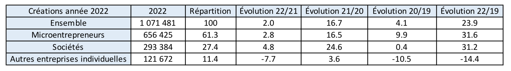 Parmi elles, 61,3 % l’ont été sous la forme de microentrepreneurs, 27,4 % en société (à gérance majoritaire ou minoritaire) et 11,4 % en entreprise individuelle autre (notamment pour les professions imposant ce type de forme, telles les professions libérales règlementées).Rappelons aussi que selon l’Urssaf, les microentrepreneurs à fin 2021 ne produisent des recettes que pour 58 % d’entre elles, ce qui conduit à chiffrer les créations « actives » au nombre de 796 000.