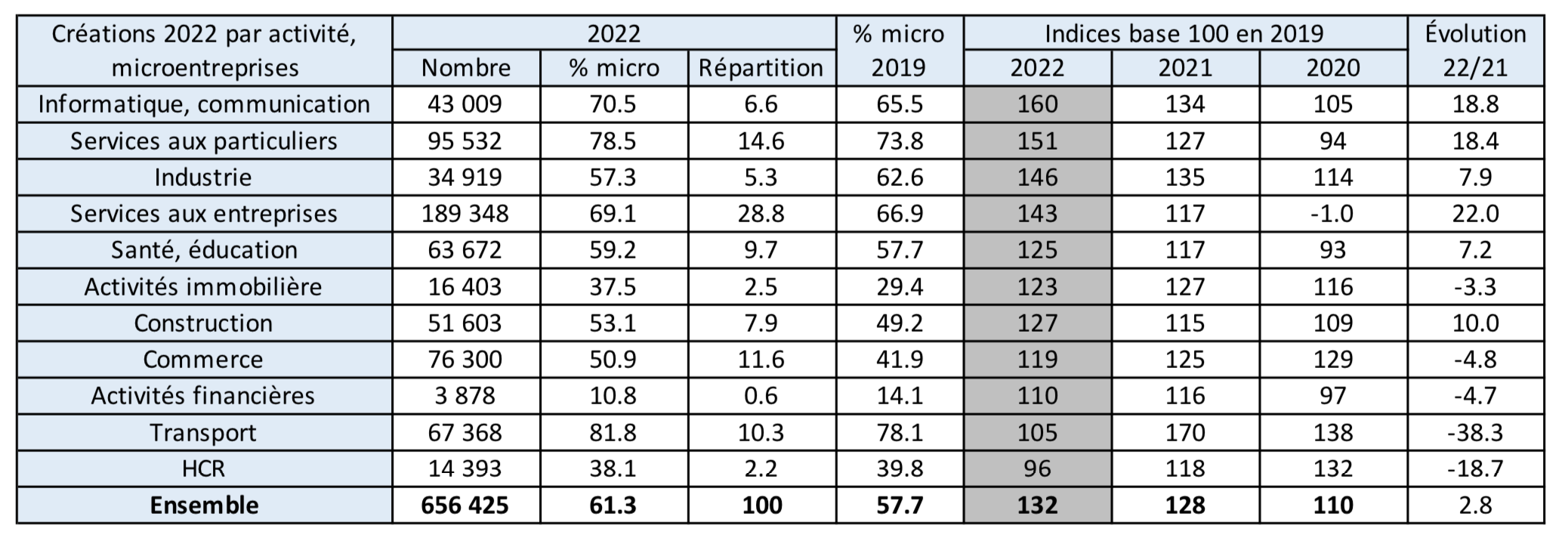 4 activités regroupent les 2/3 des microentreprises créées en 2022 : les services aux entreprises (29 %), les services aux particuliers (15 %), le commerce (12 %) et les transports (dont livraisons à domicile, avec 10 %).Certaines activités ont un taux très élevé de microentreprises telles les transports (82 %), les services aux particuliers (78,5 %), l’informatique-communication (70,5 %), alors que d’autres ont un très faible taux telles les activités financières (11 %), les activités immobilières (37,5 %) et les HCR (38 %).
