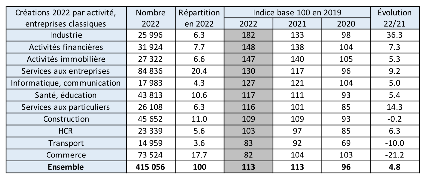 4 activités comptent pour 60 % des entreprises classiques : les services aux entreprises (20%), le commerce (18 %), la construction (11 %) et la santé-éducation (11 %).En 2022 comparé à 2021, 4 activités manifestent une progression favorable, face à une moyenne de 4,8 %, les services aux particuliers (14 %), les services aux entreprises (9 %), les activités financières (7 % chacune) et les HCR (6 %, à noter cette reprise post crise sanitaire) ; par contre le commerce chute de 21 % et les transports de 10 %.