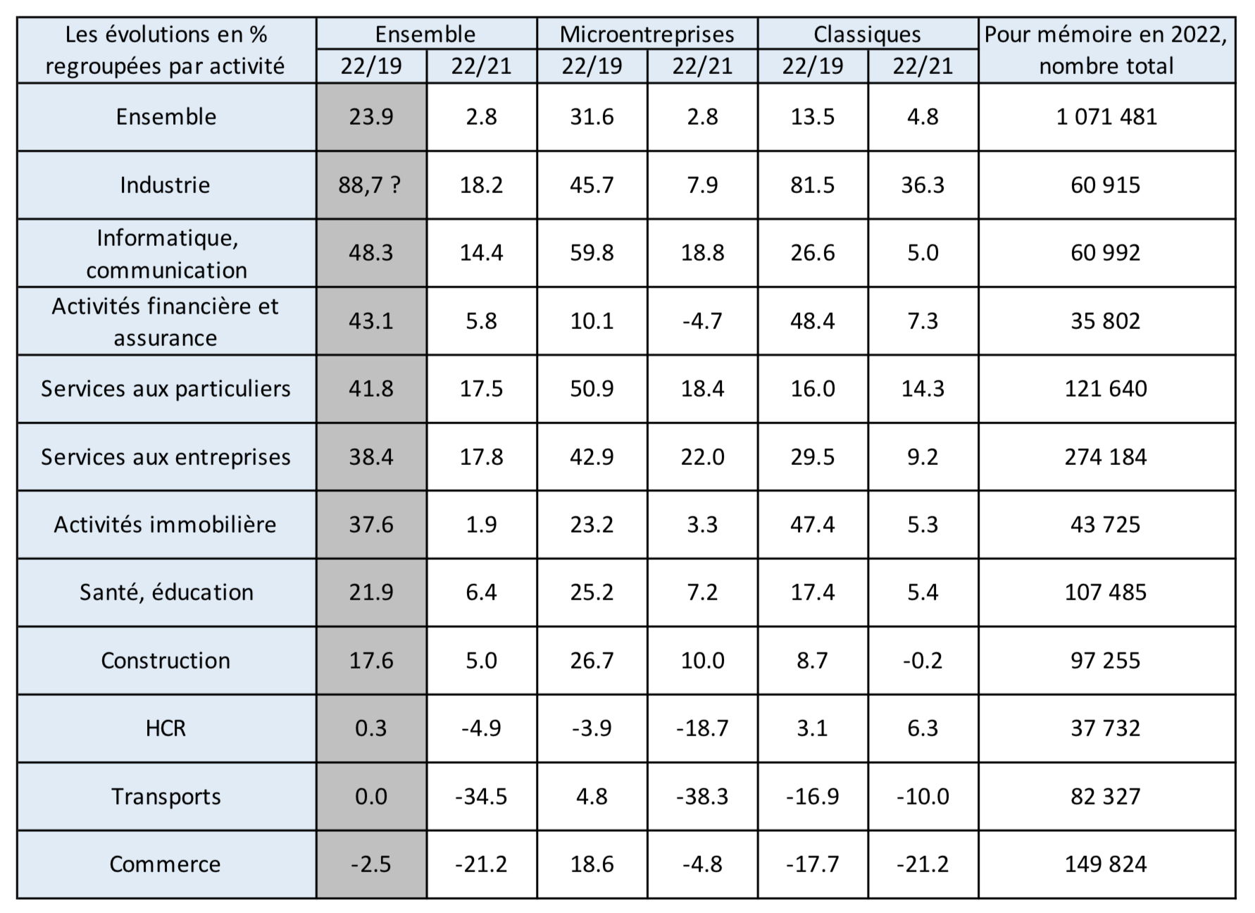 Si les sociétés et les microentreprises ont progressé de façon proche entre 2019 (année de référence) et 2022 (+31,2 et +31,6 %), les sociétés ont connu de plus fortes hausses entre 2020 et 2021 (+24,6 % vs +16,5 pour les microentreprises) et plus modestement entre 2021 et 2022 (+4,6 % vs +2,8).