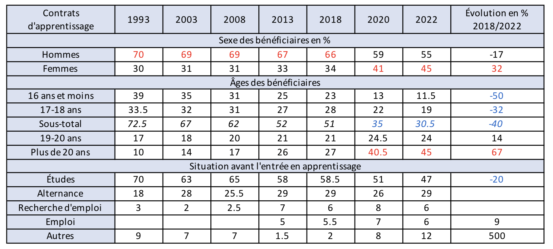 ♦ Les femmes sont plus nombreuses : elles étaient 30 % des apprenties en 1993, sans grand changement jusqu’en 2018, alors qu’elles deviennent 45 % en 2022.♦ Les 19 ans et plus, peu nombreux en 1993 (27 %) sont 69 % en 2022, avec une forte proportion des plus de 20 ans de jeunes en études supérieures.