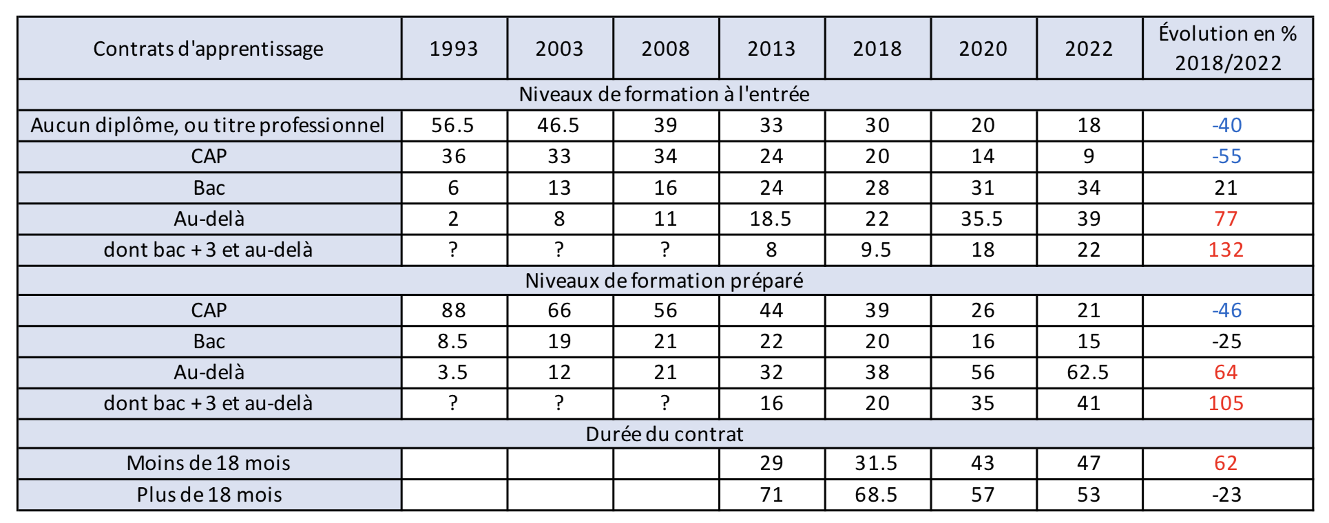 En conséquence en 2022, 62 % préparent un diplômé du supérieur lors de leur temps en apprentissage vs 3,5 % en 1993.