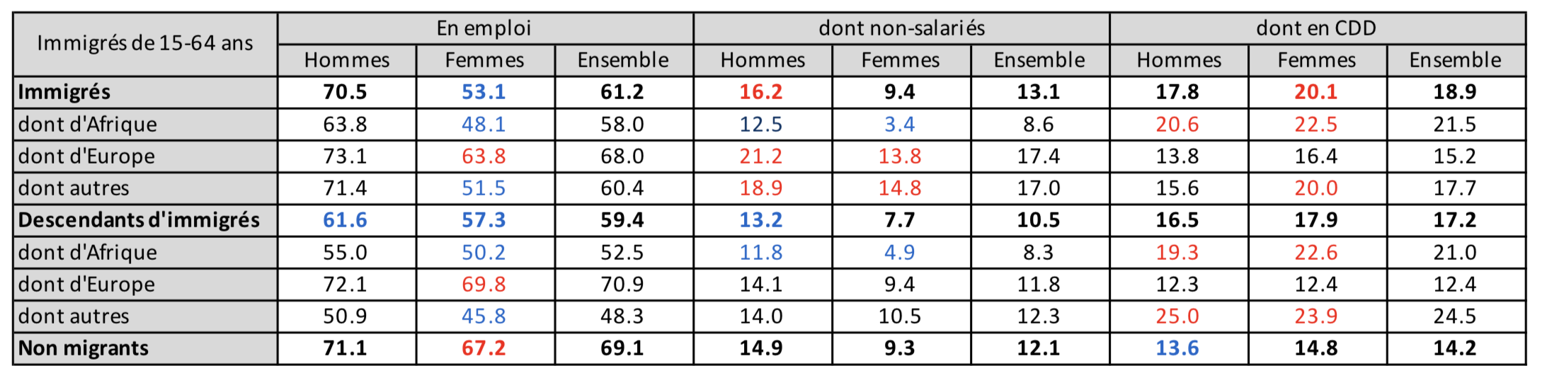 70,5 % des hommes immigrés de 15 à 64 ans sont en emploi, au même niveau que les Français, de parents Français, et que les immigrés venant d’Europe (73 %), mais en-deçà pour les immigrés d’Afrique (63,8 %).Par contre, les hommes descendants d’immigrés sont moins en emploi (61,6 %), notamment les Africains (55 %) et ceux d’Asie et autres continents (50,9 %), alors que ceux venus d’Europe, le sont même un peu plus que les Français (72,1 % vs 71,1). Pourquoi ? Notre système de protection sociale inciterait à moins d’implication que quand on arrive en France ?
