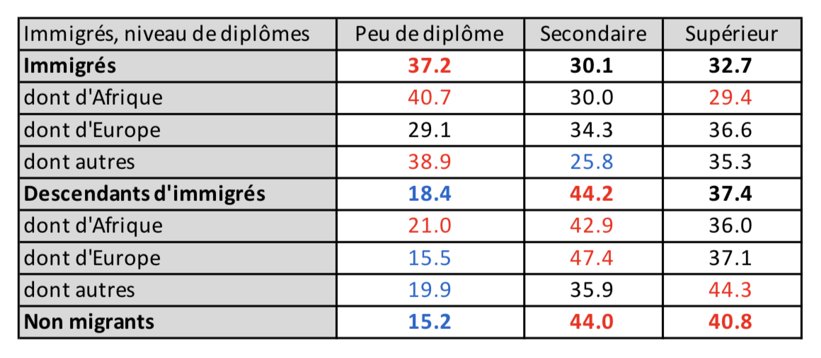 Les immigrés sont 37 % à être peu diplômés (moins les Européens, 29 %), alors que les descendants d’immigrés sont assez proches des Français (18,4 % vs 15,2). Toutefois, 33 % ont un niveau d’enseignement supérieur, vs 37 % les descendants d’immigrés et 41 % les Français.