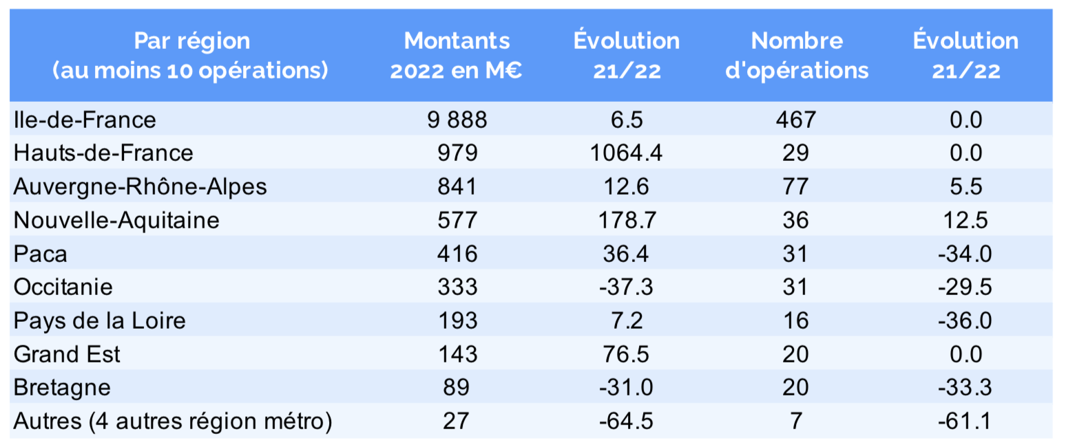 Le nombre d’opération dans les tranches de 20M€ et plus progressent de 23 % alors que leur nombre régresse de 11,4 % dans les tranches inférieures, même si le nombre d’opérations y est le plus nombreux (590 soit 80 % des opérations en 2022).