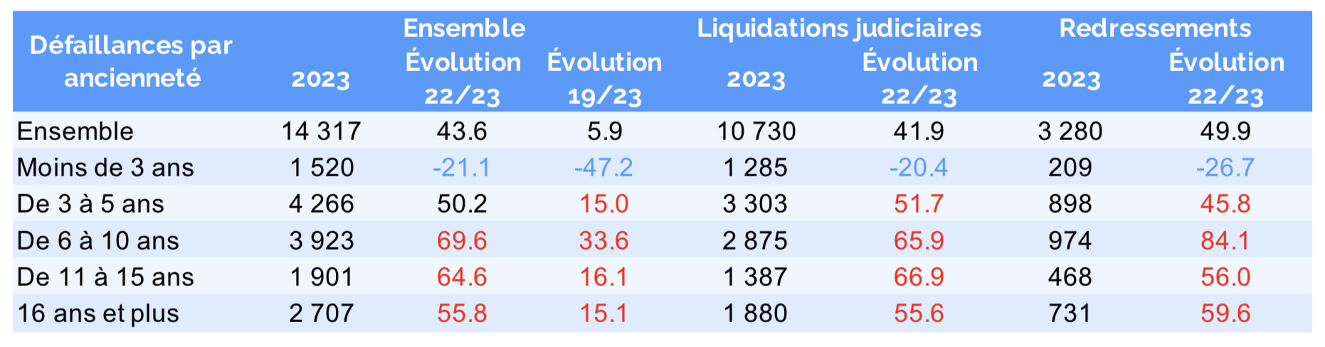 En termes d’ancienneté, les moins de 3 ans sont en net retrait au regard de 2019, comme de 2023, alors que les 3 ans et plus et notamment les 6-15 ans font état de fortes hausses, en liquidation comme en redressement.