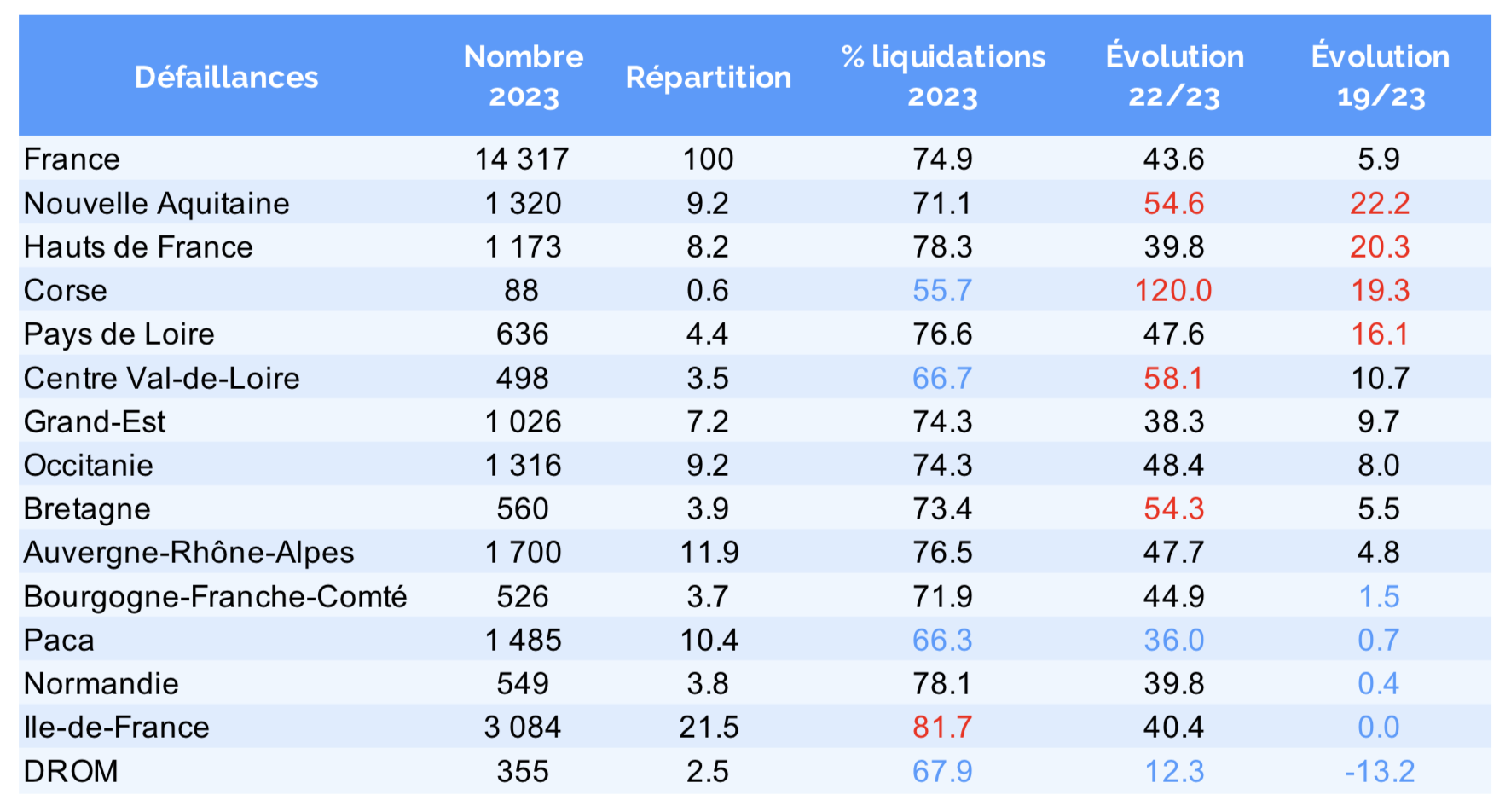 Le taux de liquidation est plus faible dans les DOM, en Corse, en Paca et en Centre Val de Loire, et le plus élevé en Ile-de-France.Certaines régions ont connu des hausses importantes comme la Corse, la Nouvelle Aquitaine, les Hauts-de-France, voire les Pays de Loire. Noter la faible hausse des défaillances dans les DOM.