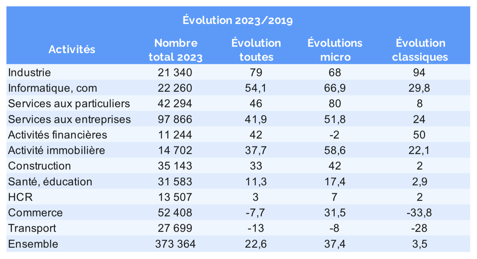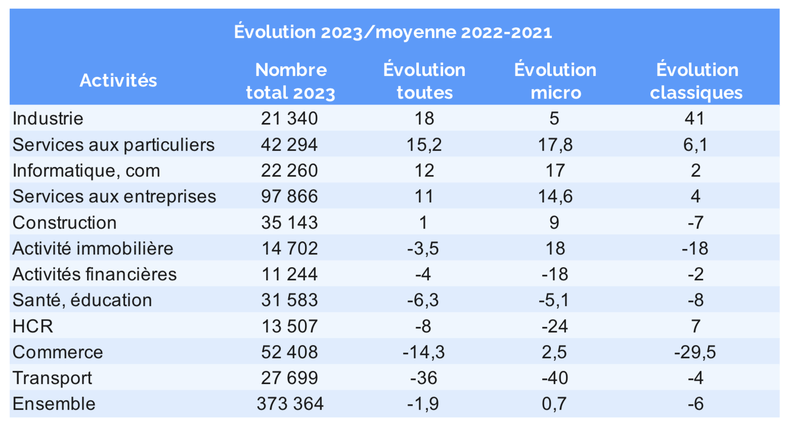 Alors que la moyenne toutes activités manifeste une baisse de 1,9 % (de 6 % pour les créations classiques et la stabilité pour les microentreprises avec 0,7 %), les activités de services (services aux particuliers, services aux entreprises, informatique) et l’industrie (qu’il faudrait pouvoir expliquer) progressent ; d’autres connaissent une relative stabilité (construction, activités immobilière et financière, voire santé/éducation et HCR), alors que chutent nettement les créations de commerce et transport (-40 % en microentreprises pour les transports).