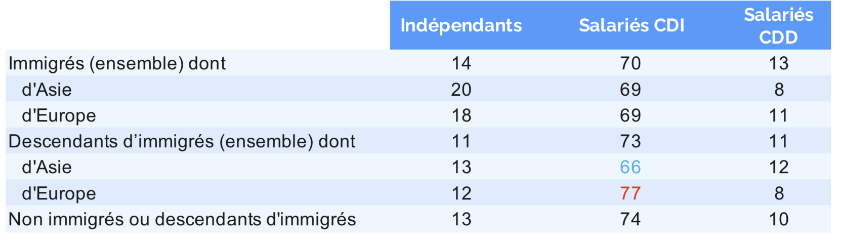 8 % des descendants d’immigrés sont indépendants (4-5 % pour les diplômes inférieurs au bac, 9 % pour les Bac +2 et plus vs 9 % pour les non immigrés dont 5-6 pour les diplômes inférieurs au Bac, et 11pour les Bac +2 et plus).Les immigrés d’Asie et d’Europe sont plus souvent indépendants (20 et 18 %) que les Français de souche (13 %) ; par contre, la situation des descendants d’immigrés est proche de celle des Français de souche.