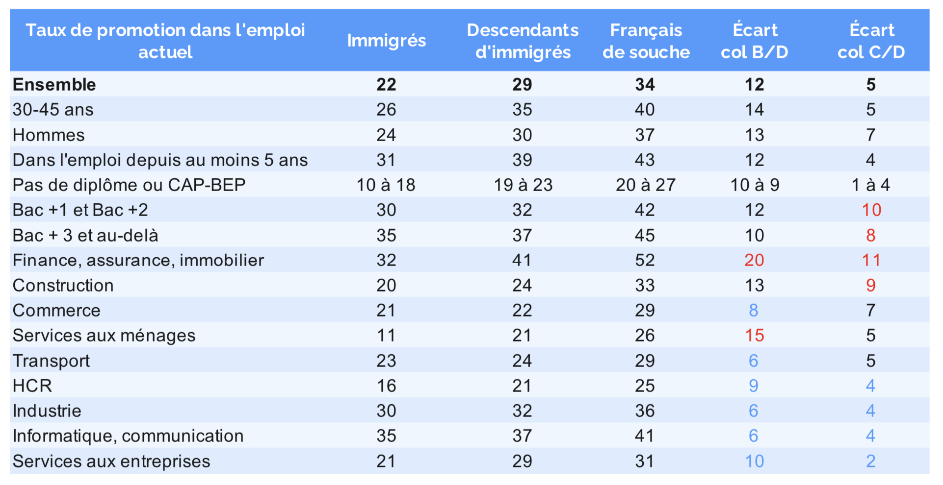 -En 2019 2020, parmi les salariés de 18 à 59 ans, les immigrés sont moins nombreux à déclarer avoir eu une promotion dans leur emploi actuel au cours des 5 dernières années : 22 % en ont bénéficié (mais 40 % pour ceux d’Italie et Espagne, vs 16 % pour ceux de Chine et 17 % ceux d’Afrique hors Maghreb), contre 29 % les descendants d’immigrés (mais 19 % ceux d’Afrique hors Maghreb) et 34 % les Français de souche.