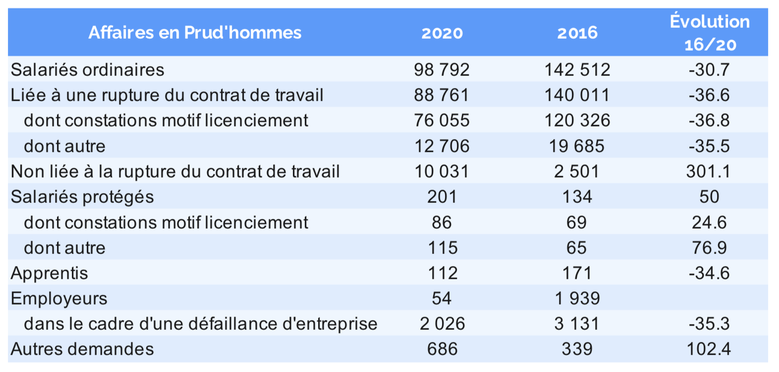 ♦ L’évolution de cette institution : le statut des conseillers prud’hommes ne sont pas, pour la majorité d’entre eux des professionnels du droit, et exercent leur activité à temps partiel et sont renouvelés. Cela conduit à un positionnement central pour le greffe, assurant la continuité tant au niveau du personnel que des méthodes ; leur effectif total était au 31 décembre 2019 de 984, diminuant de 25 % entre 2008 et 2019, le nombre d’affaires passant de 197 000 à 117 000.