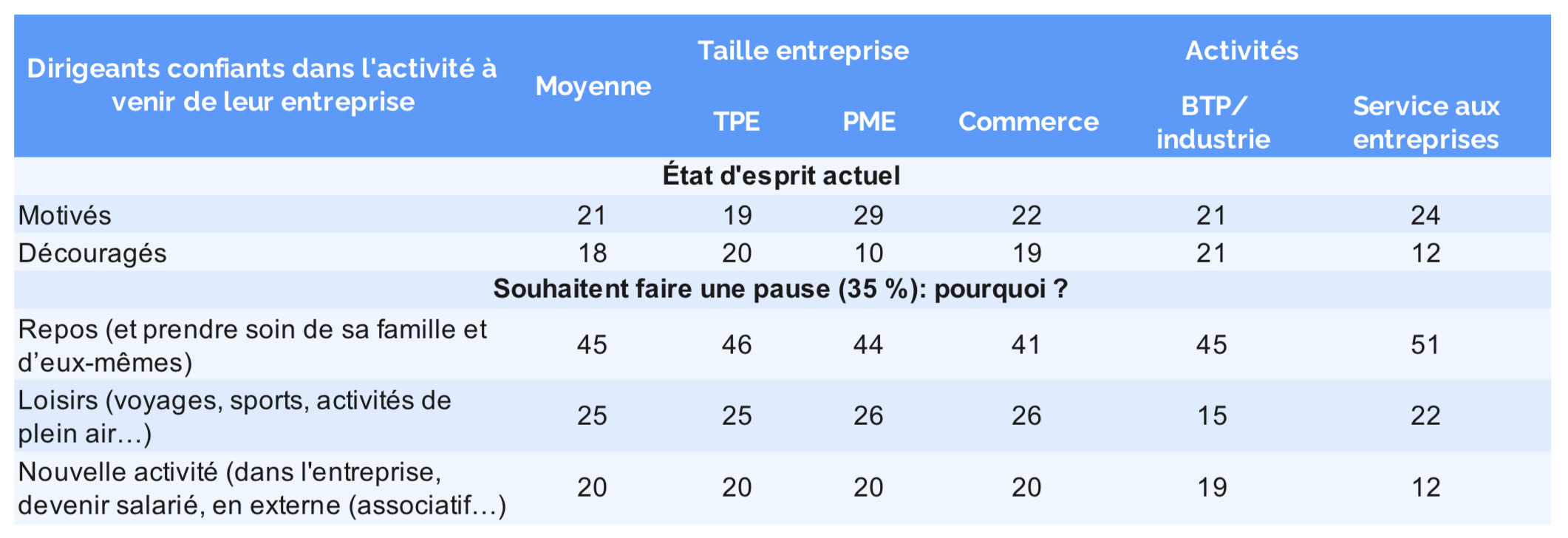 - Alors que 21 % sont motivés, prêts à relever de nouveaux défis, 29 % les PME vs 19 les TPE,