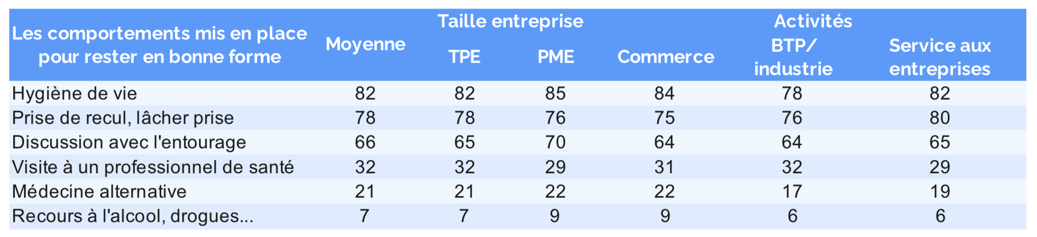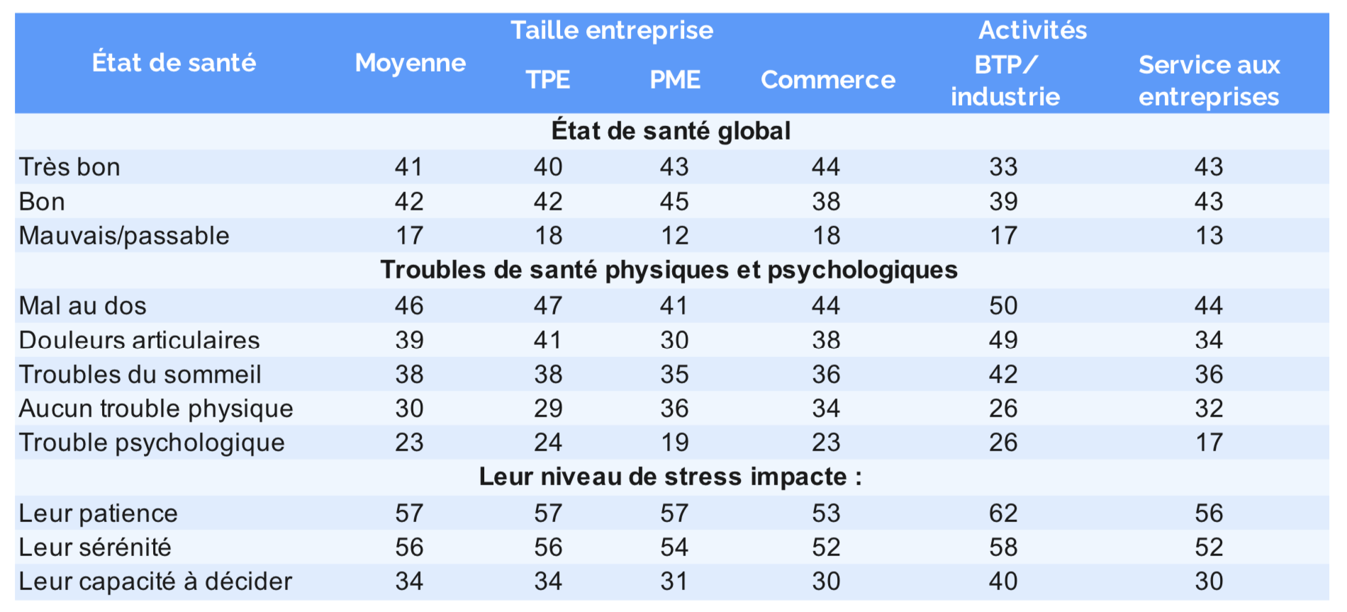 - Noter que 36 % des dirigeants de PME n’affichent aucun trouble physique vs 29 % ceux en TPE et 26 % ceux de l’industrie/BTP.