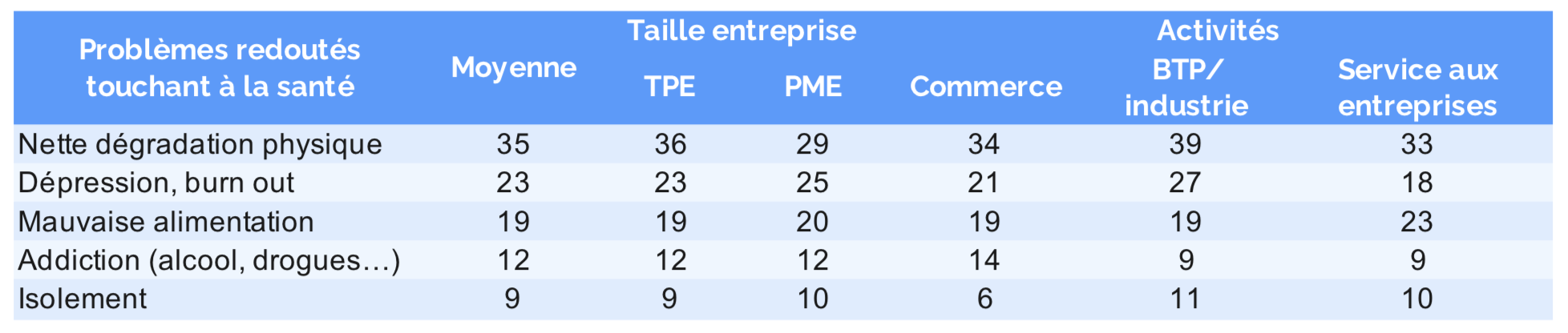 - 35 % craignent les maladies chroniques et la dégradation physique (29 les PME vs 36 % les TPE et 39 % ceux de l l’industrie et du BTP).- 23 % sont inquiets d’un burn out ou d’une dépression (27 % ceux de l’industrie/BTP vs 18 ceux des services aux entreprises).
