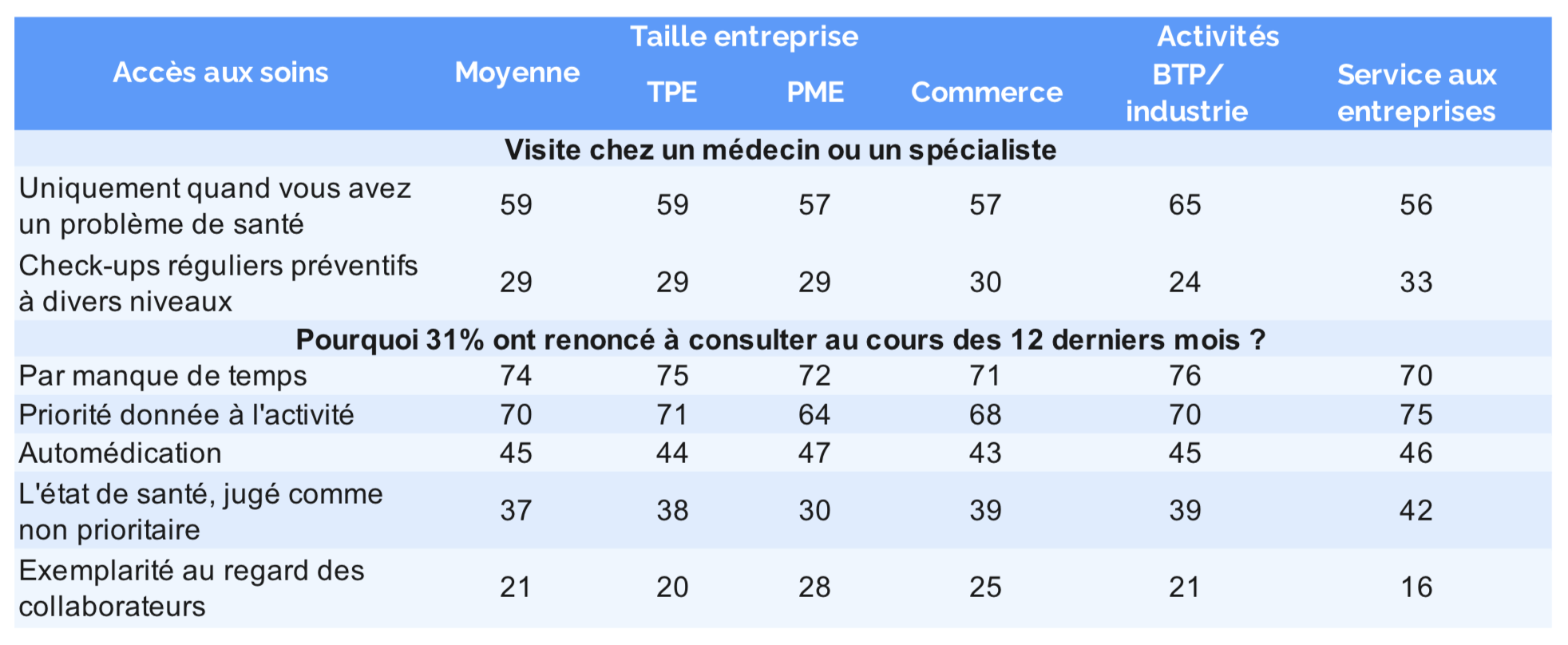 La priorité donnée à l’activité est la raison essentielle : 74 % disent par manque de temps, 70 % parce que l’activité est jugée prioritaire (70 %, moins les PME 64, mais 75 % les services aux entreprises) ; d’ailleurs la santé n’est pas jugée prioritaire pour 37 % (38 les TPE vs 30 les PME). Et puis 45 % pratiquent l’automédication.Noter que 28 % des PME vs 20 pour les TPE, ne consultent pas pour monter l’exemple à leurs collaborateurs.
