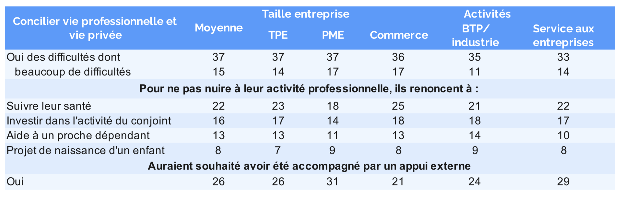 ♦ 37 % disent avoir difficulté pour y faire face, dont 15 % beaucoup. Pour ne pas nuire à leur activité professionnelle, ils ont renoncé à suivre leur état de santé (23 % les TPE vs 18 les PME), à investir dans l’activité de leur conjoint (16 %) ou dans l’appui à un dépendant proche (13 %) ; si 6 % des hommes ont renoncé à un nouvel enfant, ce sont 12 % des femmes.♦ 26 % auraient souhaité être accompagnés à ces moments-là pour mieux gérer leur équilibre vie professionnelle/vie personnelle, notamment les dirigeants de PME (31 % vs 26 les TPE).