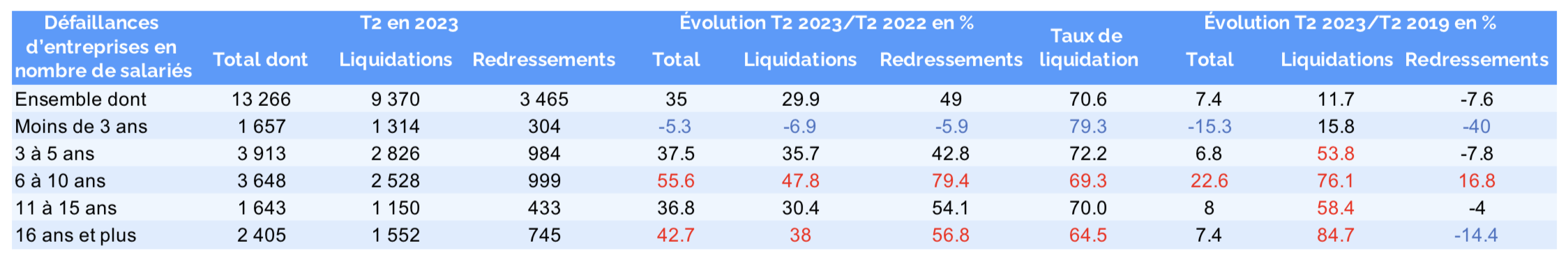 Les moins de 3 ans d’ancienneté (12 % des défaillances) ont plutôt connu des baisses dans les 2 périodes (-5 % entre 2022 et 2023 et -15,3 % entre 2019 et 2013), alors que les défaillances des plus de 3 ans progressaient de 37 à 56 % entre 2022 et 2023 et de 7 à 23 % entre 2019 et 2023. Noter toutefois que les fortes progressions entre 2022 et 2023 le sont à la fois pour les liquidations et pour les redressements, alors qu’elles ne le sont que pour les liquidations entre 2019 et 2023.