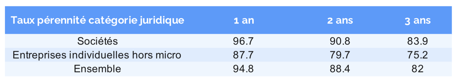 ♦ Le taux des créations classiques à 3 ans est de 82 %, mais de 84 % pour les sociétés et de 75 pour les entreprises individuelles (hors microentrepreneurs). Les entreprises individuelles ont connu une plus forte perte de d’entreprises nouvelles 1 et 2 ans après leur création que les sociétés (perte de 20 points vs 9 pour les sociétés).