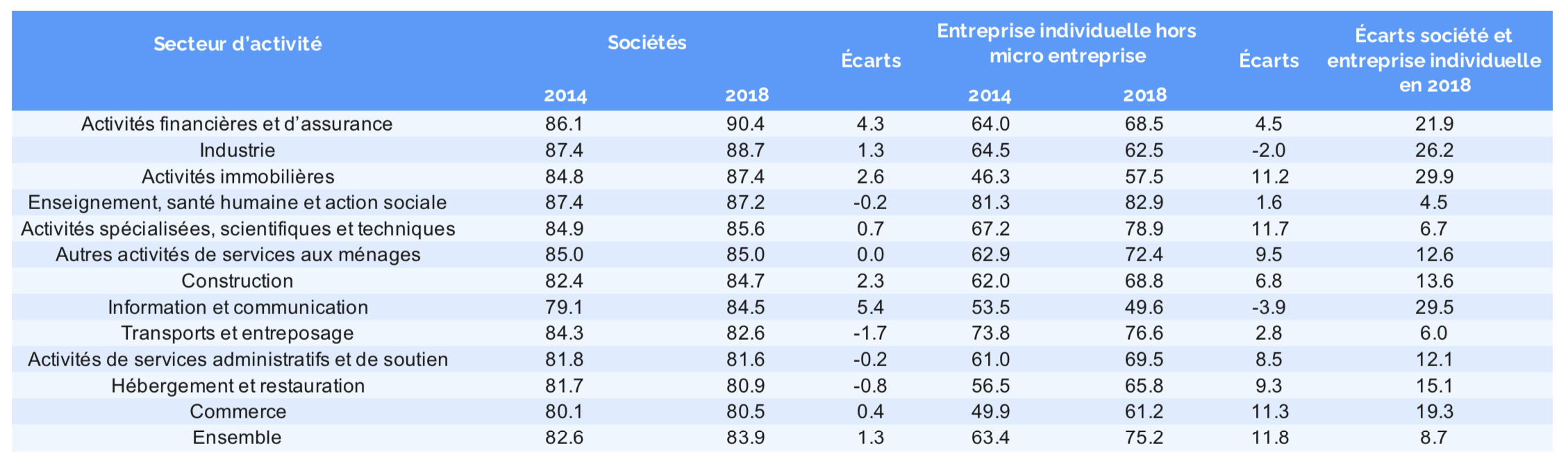 ♦ Les sociétés ont progressé de 1,3 point entre 2014 et 2018 (de 82,6 à 83,9%) contre +11,8 points pour les entreprises individuelles hors microentrepreneurs (de 63,4 à 75,2 %).♦ Mais les comparaisons 2018/2014 sont à prendre avec précaution. Entre 2014 et 2018, la pérennité des entreprises augmente en partie du fait du changement de la structure de l’échantillon ; au global, 3,3 points sont dus à un effet de structure lié au poids plus important des sociétés en 2018 ; pour les entreprises individuelles, la forte hausse doit être tempérée par la baisse du nombre d’entreprises individuelles (du fait du régime de la microentreprise qui a connu une forte hausse), ces dernières étant plus développeurs que celles de la génération 2014).