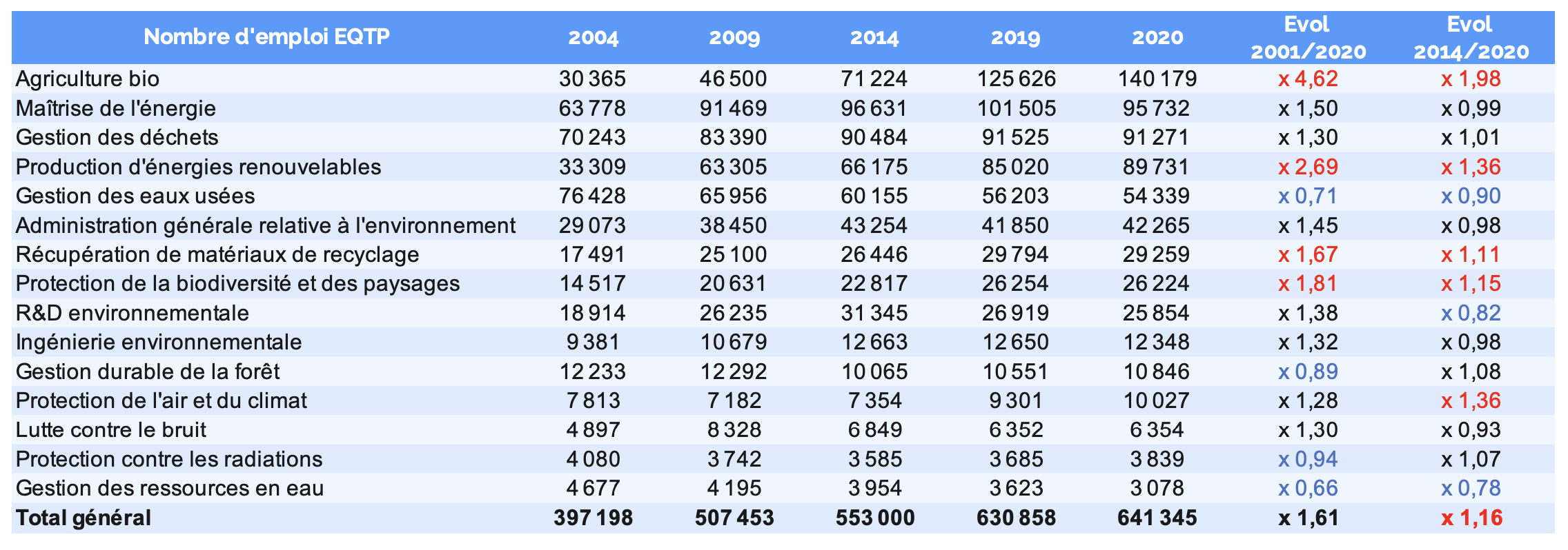 Les éco-activités emploient 641 350 personnes en équivalent temps plein (EQTP) en 2020 ; ils étaient un peu moins de 400 000 en 2004 et 553 000 en 2014 et donc des progressions de 61 % et de 16 % au regard de 2022.L’agriculture biologique est le secteur qui regroupe le plus d’emploi (140 179, 22 % des effectifs des éco-activités) et celui qui a le plus progressé entre 2004 et 2020 (4,6 fois plus) et même entre 2014 et 2020 (doublement).