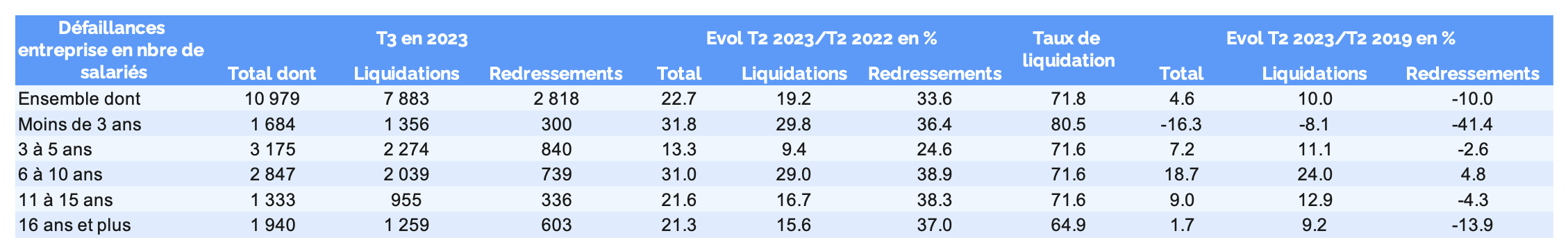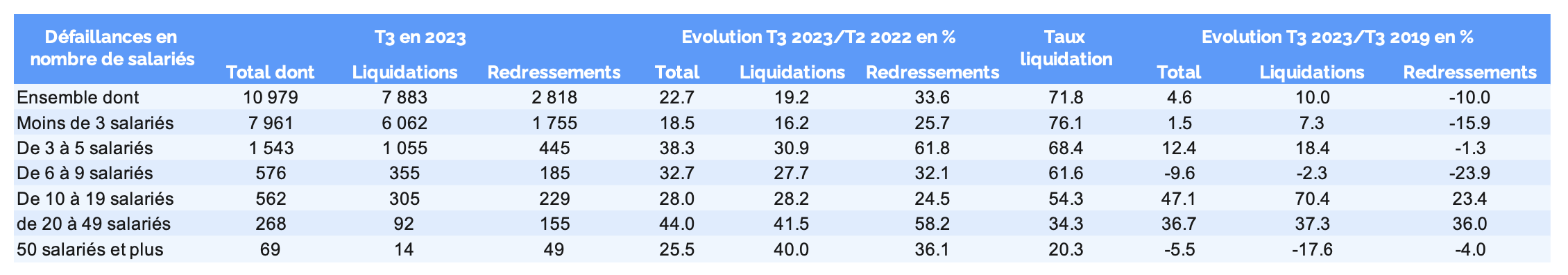 Les 3 salariés et moins et les tailles inconnues sont toujours les plus nombreux (7 961 ou 72,5 % des défaillances), les 3-19 salariés 24,4 % et les plus de 20 salariés (337 ou 3,1 %), rappelant que les très petites entreprises sont de loin très concernées par les défaillances.Les défaillances des moins de 3 salariés ont moins progressé entre 2023 et 2022 (+18,5 %) que les 3 salariés et plus (+35,4 %, notamment les 20-49 salariés avec +44 %). Il en est de même de la progression au regard de 2019 (respectivement +1,5 % vs +13,4 %).