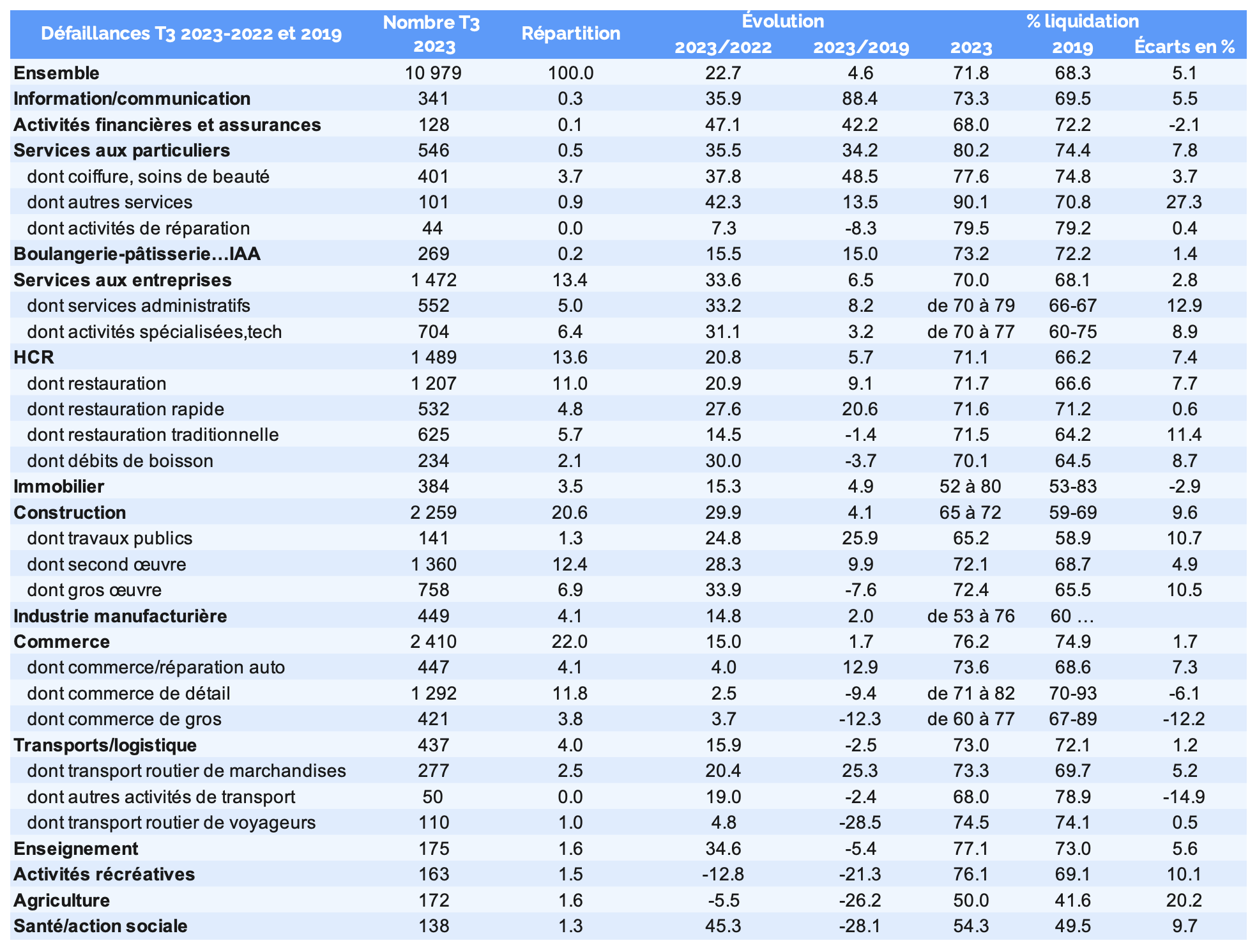 Le nombre de défaillances du 3e trimestre 2023 chiffre 10 979 entreprises défaillantes, en hausse de 23 % au regard de la même période 2022, de +3,9 % par rapport à 2019 et -3 % par rapport à la moyenne annuelle 2016-2018, montrant le retour “à la normale” avec la période pré covid.Cependant, le nombre de liquidations judiciaires est en hausse avec 71,8 % des défaillances vs 68 % pour la moyenne annuelle 2016-2019, au profit d’une baisse des redressements : -10,8 % au regard de 2019 et -16,3 % au regard de la moyenne 2016-2018. Pour sa part, le nombre de sauvegardes a progressé avec 278 sauvegardes en 2023, soit +21,4 % au regard de 2022, +35,6 % au regard de 2019 et +20,8 % au regard de la moyenne 2016-2018 ; c’est que le nombre d’entreprises de type PME a lui aussi augmenté.