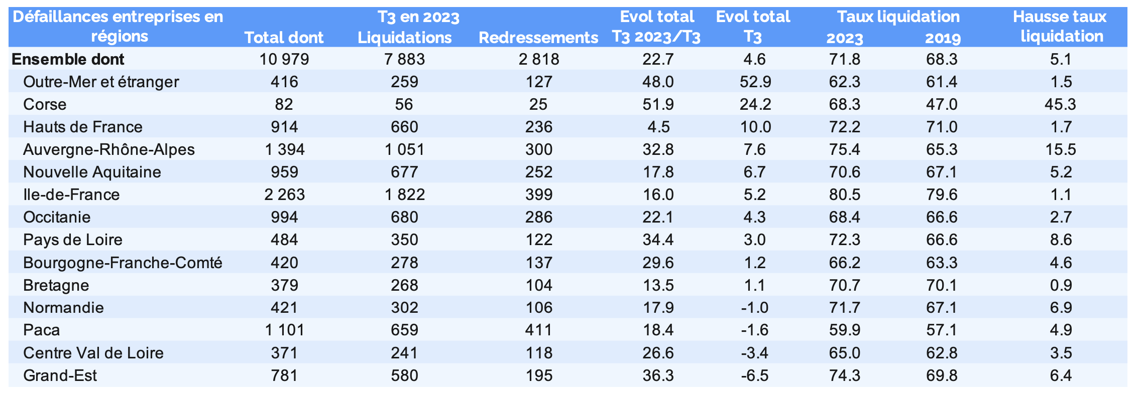 Globalement la hausse du nombre de défaillance affiche entre 2022 et 2023, 23 % et entre 2019 et 2023, 4,6 %.3 régions connaissent une forte hausse des défaillances et entre 2022 et 2023 et 2019 et 2023 : l’outremer (48 et 53 %), la Corse (52 et 24 %) et plus modestement les Hauts de France (5 et 10 %).