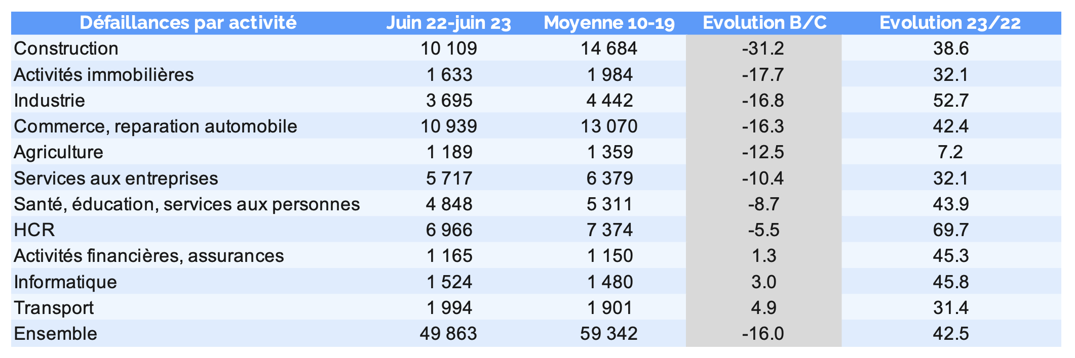 ♦ La répartition sectorielle des défaillances à juillet 2023 est globalement comparable à celle observée durant la période pré-Covid 2010-2019. Le nombre de défaillances sur 12 mois reste significativement inférieur à son niveau moyen pré-Covid dans la plupart des secteurs, sauf pour les activités de livraison à domicile, et l’informatique.
