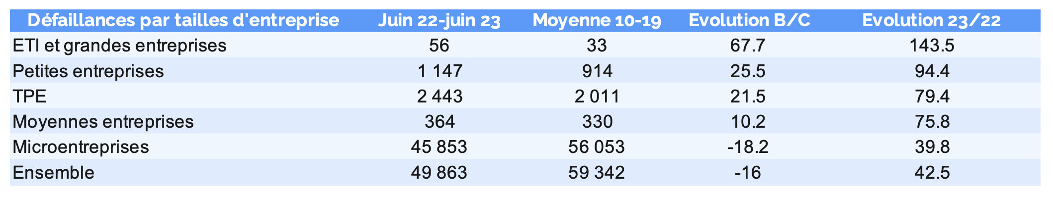 Les PME hors microentreprises font état d’un nombre d’emplois menacés comparable à ce qu’il était en 2011, alors que pour les ETI et les grandes entreprises leur nombre est supérieur à celui de la période pré-Covid.Le nombre d’emplois menacés par les défaillances doit cependant être considéré comme un plafond, la procédure collective ne conduisant pas forcément à la destruction de l’ensemble des emplois. Ainsi, les chiffres de la Dares (2023) relatifs aux entrées à Pôle emploi à la suite d’un licenciement s’inscrivent en nette hausse à fin 2022, mais restent à des niveaux inférieurs à ceux de 2019.