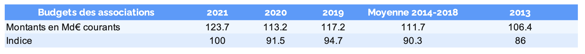 Les employeurs ont un budget de 104,804 Md€ et les non-employeurs de 8,551Md€. Le budget total de 113Md€ est en baisse de 3,4 % au regard de 2019. Les budgets sont restés stables pour 47 % des associations employeuses, ils ont diminué pour 41 %. En revanche le budget 2021 a chiffré124Md€.