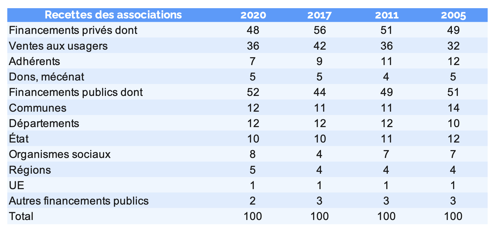 48 % recettes proviennent du secteur privé dont 36 % de la vente aux usagers. 52 % proviennent du secteur public dont 29 % des collectivités territoriales.