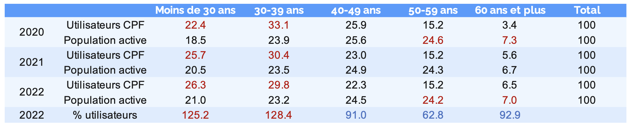 Les utilisateurs sont plus jeunes que l’ensemble de la population active : si 56 % ont moins de 40 ans (44 % dans la population active), les 50-59 ans sont particulièrement sous-représentés (15 % vs 24% parmi la population active). Noter que les 60 ans et plus (6 %) sont la seule catégorie d’âge pour laquelle le nombre d’entrants en formation CPF continue d’augmenter en 2022 (+ 9 % sur un an).