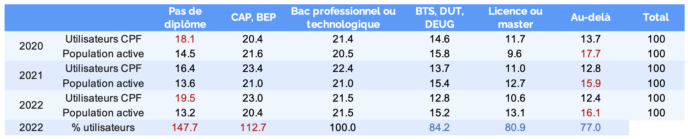 42 % des utilisateurs du CPF ont un niveau d’études inférieur ou égal au CAP ou BEP (vs 34 % dans la population active), une part en hausse depuis 2020, tandis que la part des diplômées du supérieur ou égal à bac+2 recule depuis 2020 (36 % en 2022), alors qu’elle augmente très légèrement parmi les actifs (44 % en 2022).