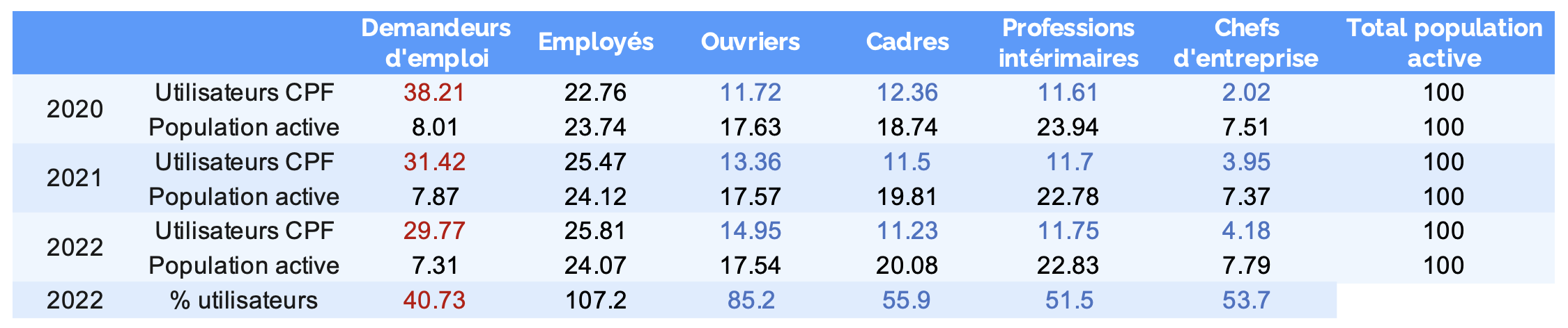Les demandeurs d’emploi inscrits à Pôle emploi demeurent les principaux utilisateurs du CPF, même si leur part diminue depuis 2020 (de 38 %, elle passe à 31 % en 2021 puis à 30% en 2022) ; c’est la catégorie pour laquelle le nombre d’entrants en formation CPF recule le plus entre 2021 et 2022 (-10 %), suivie par celle des cadres (-7 %), alors que celle des ouvriers (15 % des utilisateurs, 23 % en 2021 et 12 % en 2020) progresse de 6 %.