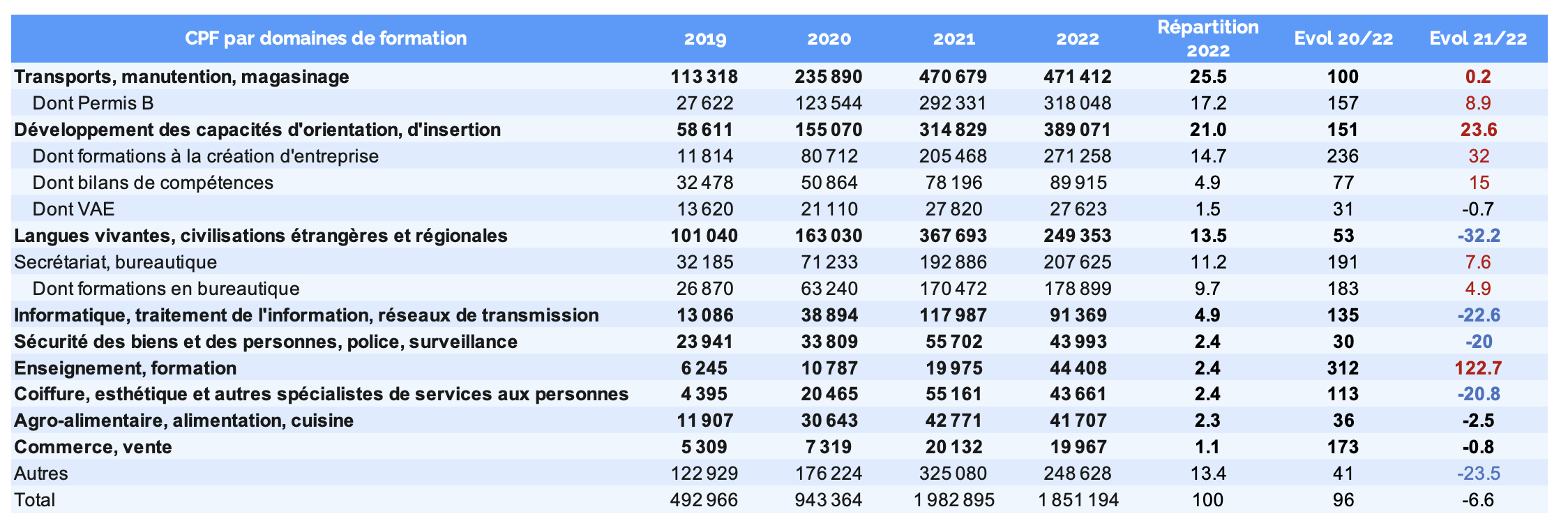 Depuis 2019, le domaine des transports est celui qui comptabilise le plus d’entrées : 471 400 en 2022 (26 % des formations financées par le CPF), notamment la formation au permis de conduire de catégorie B (17 % des entrées en CPF et 67 % du domaine des transports en 2022).Viennent ensuite le développement des capacités d’orientation, d’insertion ou de réinsertion sociales et professionnelles (21 %), les langues (13 % des entrées, mais en baisse de 32 %, sans doute parce que plusieurs formations sont exclues du financement).