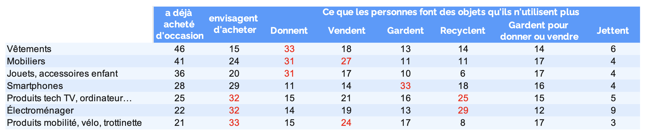 3 types de produit sont davantage achetés de seconde main : les vêtements (46 % et 61 si l’on inclut ceux qui veulent acheter), le mobilier (41 et 65), les jouets et accessoire enfant (36 et 56) ; si les 4 autres produits (de type technique) ont été moins souvent achetés en seconde main (entre 21 et 28 %), les intentions de le faire sont plus fréquentes (32 %).Les produits les plus achetés en seconde main sont aussi ceux qui seraient plus souvent donnés, alors que les produits plus techniques seraient plus souvent recyclés.