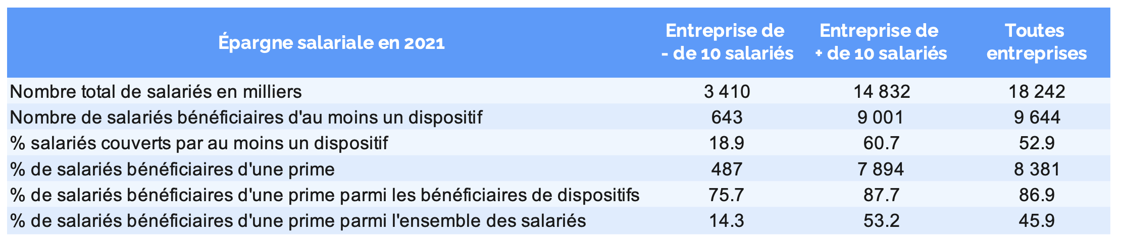 Pour en savoir davantage : "L’épargne salariale en 2021 Nette augmentation des primes dans le contexte de reprise économique", Dares Résultats N°64, novembre 2023