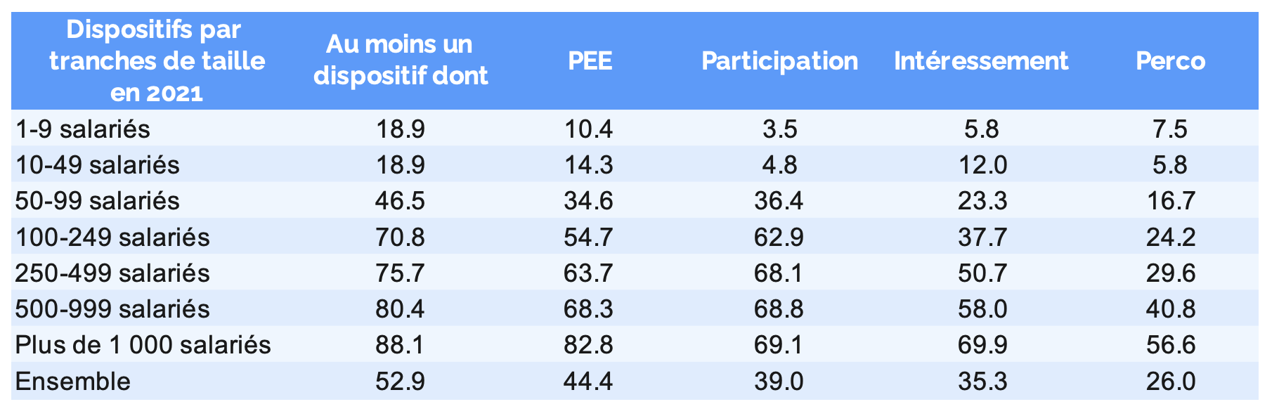 En 2021, 52,9 % des salariés du secteur privé non agricole sont couverts par au moins un dispositif d’épargne salariale (participation, intéressement, plan d’épargne entreprise – PEE -, ou plan d’épargne retraite collectif -Perco1 -). 9,6 millions de salariés sont ainsi concernés par au moins un des 4 dispositifs en 2021. Le PEE reste le dispositif le plus répandu avec 44,4 % des salariés couverts devant la participation aux résultats de l’entreprise (39) ; 35,3 % bénéficient de l’intéressement, et 26 % du Perco (+ 0,8 point).Dans les entreprises de 10 à 49 salariés, le taux de couverture est de 18,9 % en 2021, celui des 50-99 salariés de 46,5 % et dans les 500 salariés et plus de 80,4 %, et même 94 % dans les grandes entreprises. Au sein des moins de 10 salariés le taux est de 18,9 % vs 60,7 pour les 10 salariés et plus.
