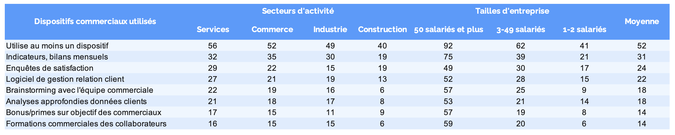 Pour 67 % elle est satisfaisante mais perfectible : notamment 72 % pour ceux de la construction, 76 % pour les 50 salariés et plus. Elle est jugée inexistante pour 8 % et très insatisfaisante pour 11 % ; 14 % pour les services en ce qui concerne le cumul des 2 items et 13 % pour les 1-2 salariés.Quels dispositifs commerciaux existent ?