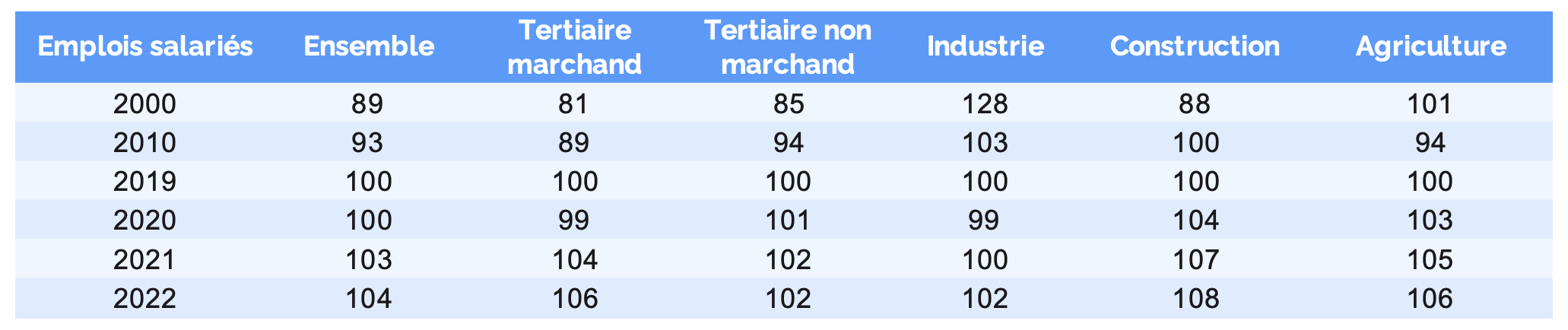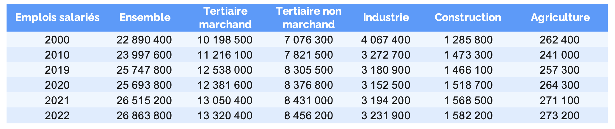 - Le nombre de salariés dans le tertiaire non marchand ne progressait que de 2 % entre 2019 et 2022 et de 20 % entre 2000 et 2022.
