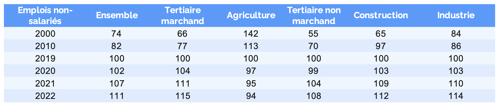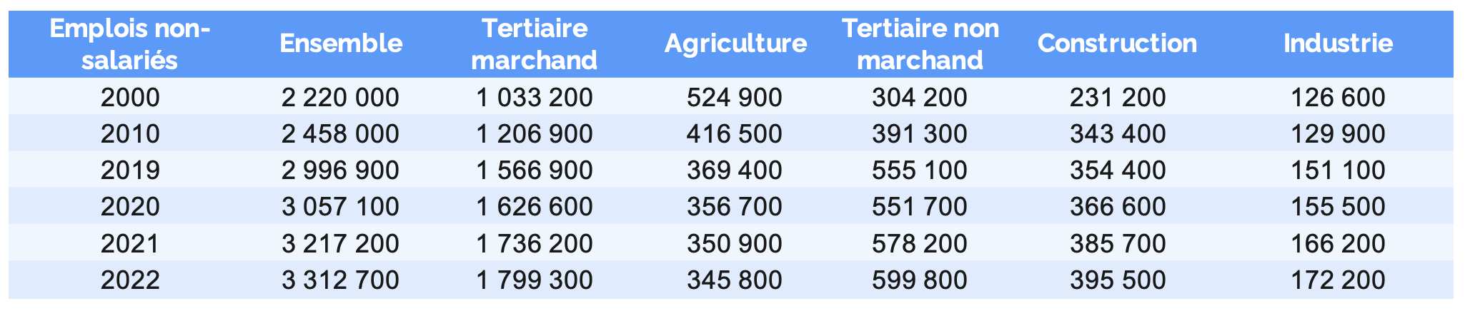 Le tertiaire non marchand (18 % des non-salariés en 2022) a davantage cru (+82 % entre 2000 et 2019), mais seulement +8 % entre 2019 et 2022 et +97 % entre 2000 et 2022.