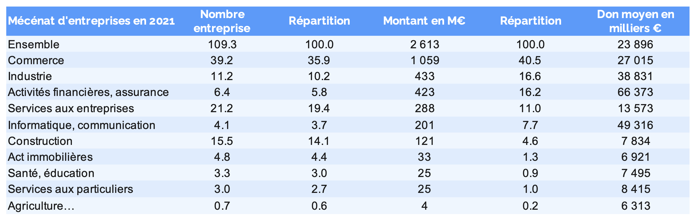 Le secteur du commerce est le plus généreux, représentant 40 % du montant des dons d’entreprises. En y ajoutant le secteur de l’industrie, celui des activités financières et d’assurance, des services aux entreprises dont celui de l’informatique, on atteint 90 %.