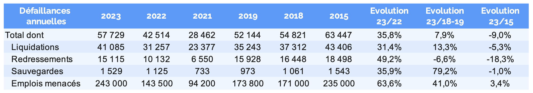 La banque de France a aussi publié son analyse “Le nombre de défaillances a progressé en 2023, mais il reste inférieur à sa moyenne pré-pandémique” dans Stat Info du 4 janvier 2024, avec un chiffrement provisoire quelque peu différent 55 492 (Altares, 57729), sans apporter d’informations nouvelles.