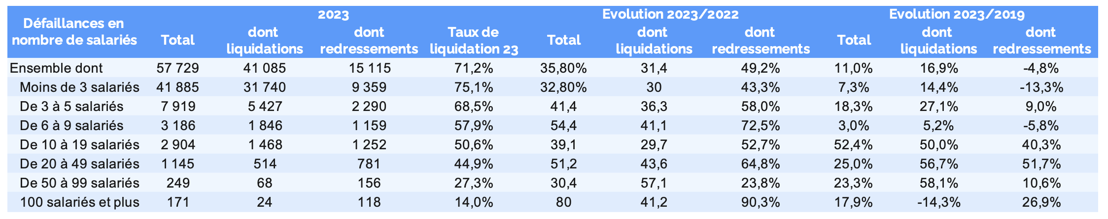 Elles sont défavorables aux 6-9 salariés (+54 % au regard de 2022, dont +72,5 % pour les redressements judiciaires) et à la fois aux 20-49 salariés (+51 % dont +65 pour les redressements) et aux 100 salariés et plus (+80 % dont +90 pour les redressements sachant qu’elles ne sont que 171 entreprises défaillantes).Mais si nous comparons 2023 à 2019, ce sont les 10 salariés et plus qui connaissent les plus fortes hausses (entre 18 et 52 % vs 11 en moyenne toutes tailles), notamment en liquidations directe (entre 50 et 58 %).