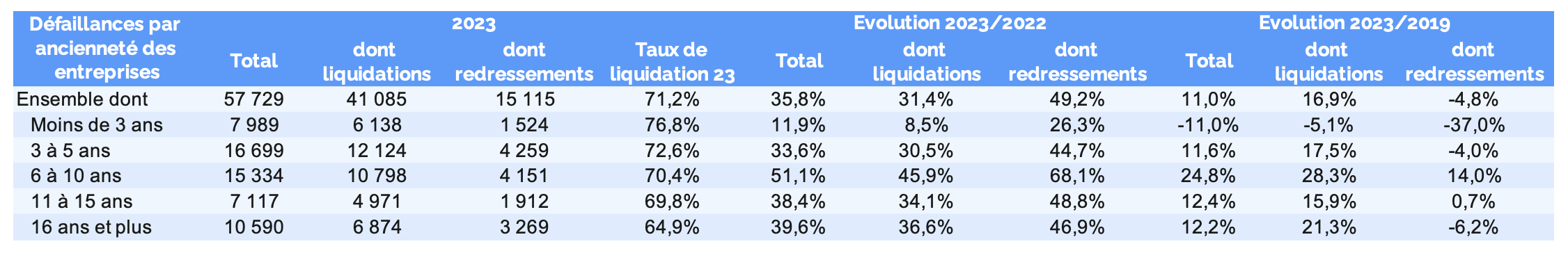 Les 6-10 ans affichent une évolution des défaillances de 51 % entre 2022 et 2023 vs 34-40 % les autres anciennetés, sauf les moins de 3 ans (12 %). Comparé à 2019, ce sont à nouveau les 6-9 salariés qui défaillent le plus (25 % vs 12 % pour les autres sauf les moins de 3 ans en baisse de 11 %).