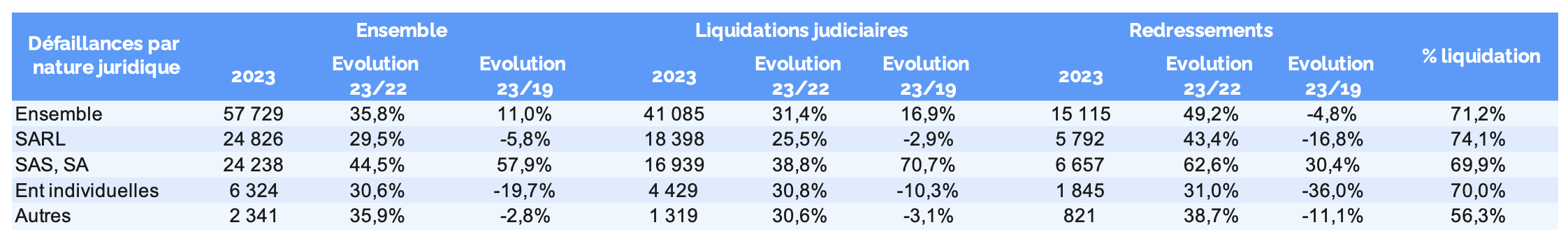 Les SAS/SA - structure juridique la plus sollicitée lors de la création de l’entreprise - progressent en nombre de défaillances entre 2022 et 2023 de 45,5 % vs 30 environ pour les autres types de structure juridique et de 58 % au regard de 2019, alors que les SARL connaissent une baisse de 6 % et les entreprises individuelles de 20 % (prudence quant à ces dernières, dans la mesure où le plus habituellement, elles ne passent pas par la défaillance mais par un arrangement amiable).