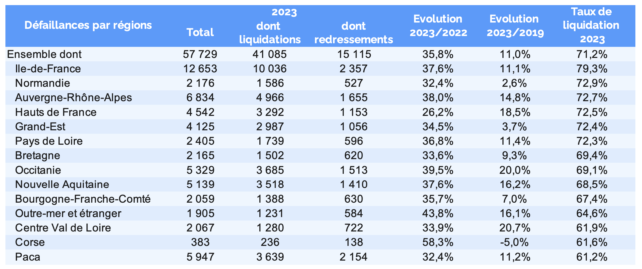 La hausse du taux de défaillance entre 2022 et 2023 est proche (entre 32 et 40 %) quelles que soient les régions. En revanche, l’évolution est fort contrastée entre 2019 et 2023 (entre -5 et +21 %).Noter les pratiques différentes des tribunaux de commerce en ce qui concerne les liquidations judiciaires : les taux sont plus élevés en Ile-de-France, dans l’est et le nord (72-79 %) et plus faibles dans les autres régions (61 à 69 %).