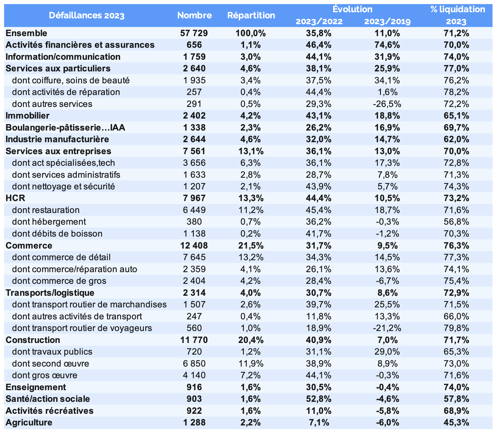 Les liquidations directes sont 71,2 % des défaillances et les redressements judiciaires 26,2 %. En 2022 les défaillances chiffraient 42 514 (soit +35,8 % en 2023), dans un contexte de “normalisation” après la crise covid. Pour mémoire, elles étaient 28 462 en 2021. Plus pertinent est d’observer 2019 où elles chiffraient 52 144 (+10,7 %), voire 2015 (63 447 défaillances et -9 % au regard de 2023).Ce sont les redressements judiciaires qui ont connu les plus fortes hausses : +49,2 % au regard de 2022 vs +31,4 pour les liquidations directes.